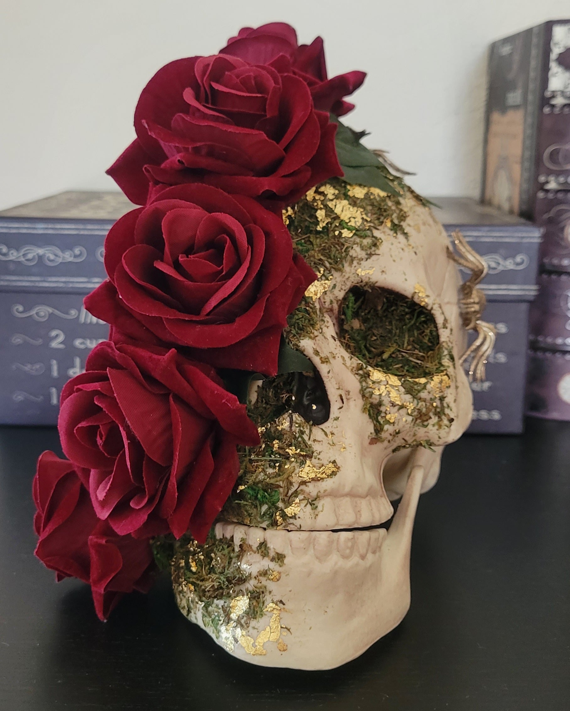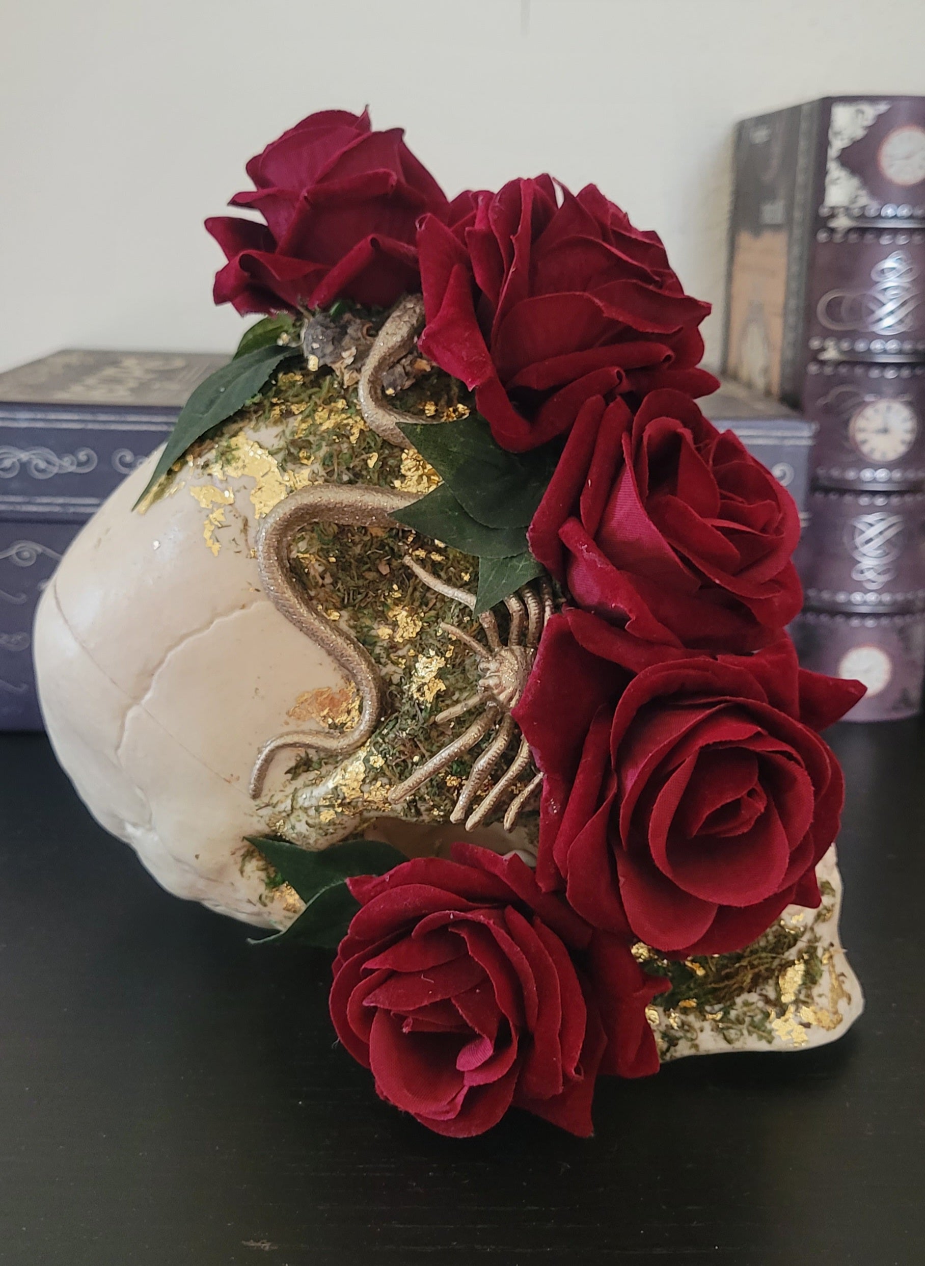 Blood Red Roses surrounded with moss covered in gold flakes. The skull has that rotting aging look with a dark fantasy vibe. Gold creepy crawlers crawling around.