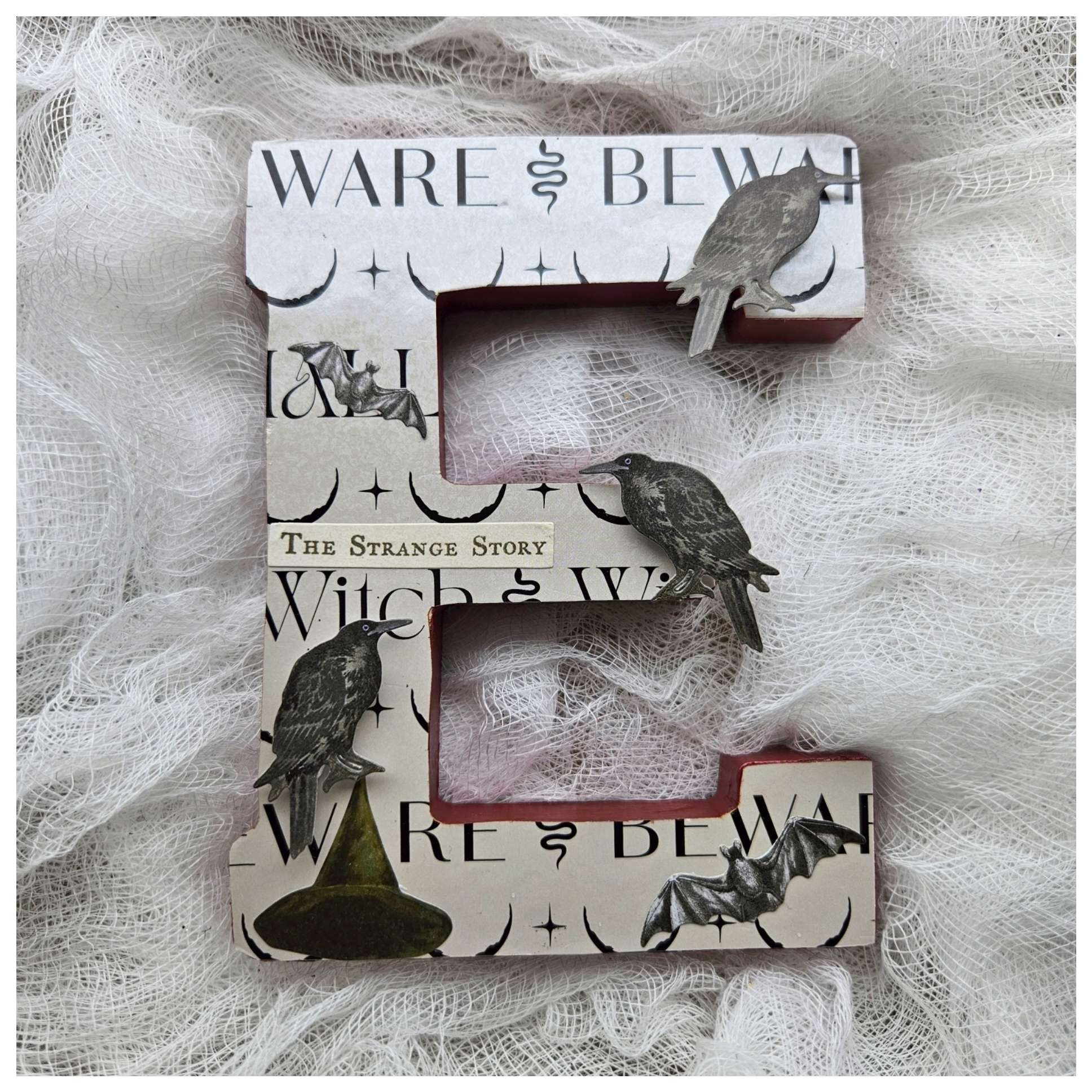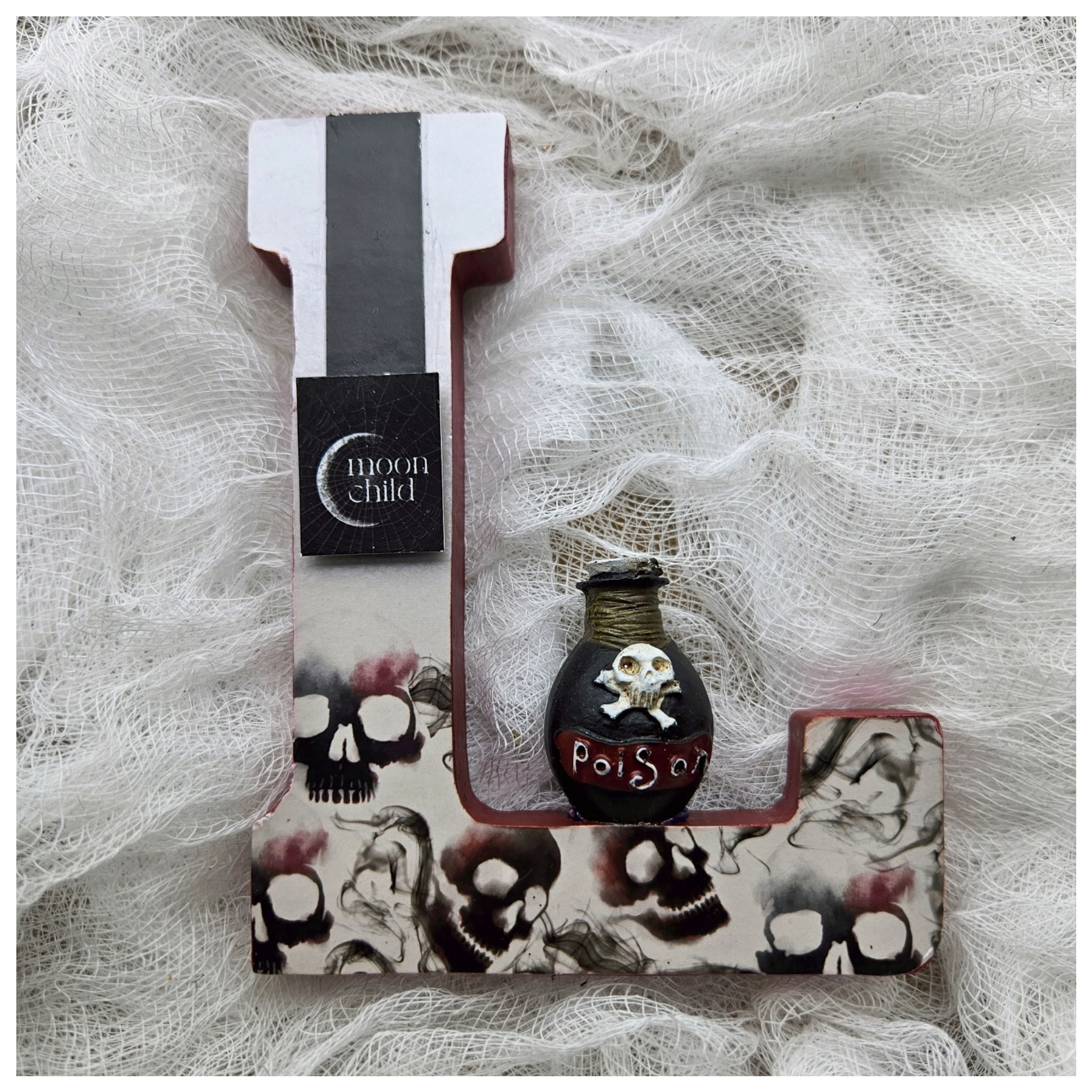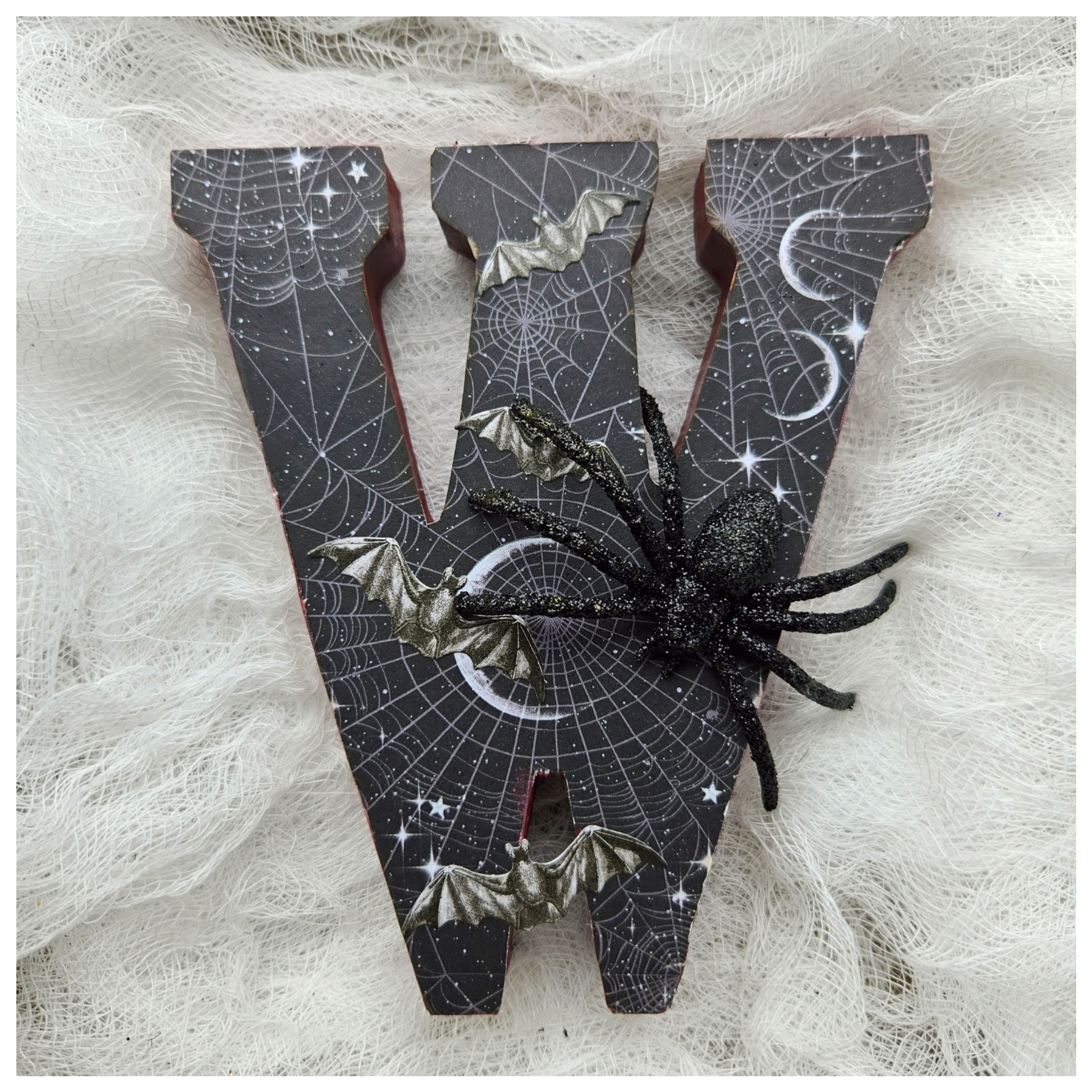 Each letter is hand painted with a dark burgundy acrylic craft paint, spooky and fun accessories on each letter. The double letters have a reflective paper when you hit it with the light and black glitter on the laser cut pieces.